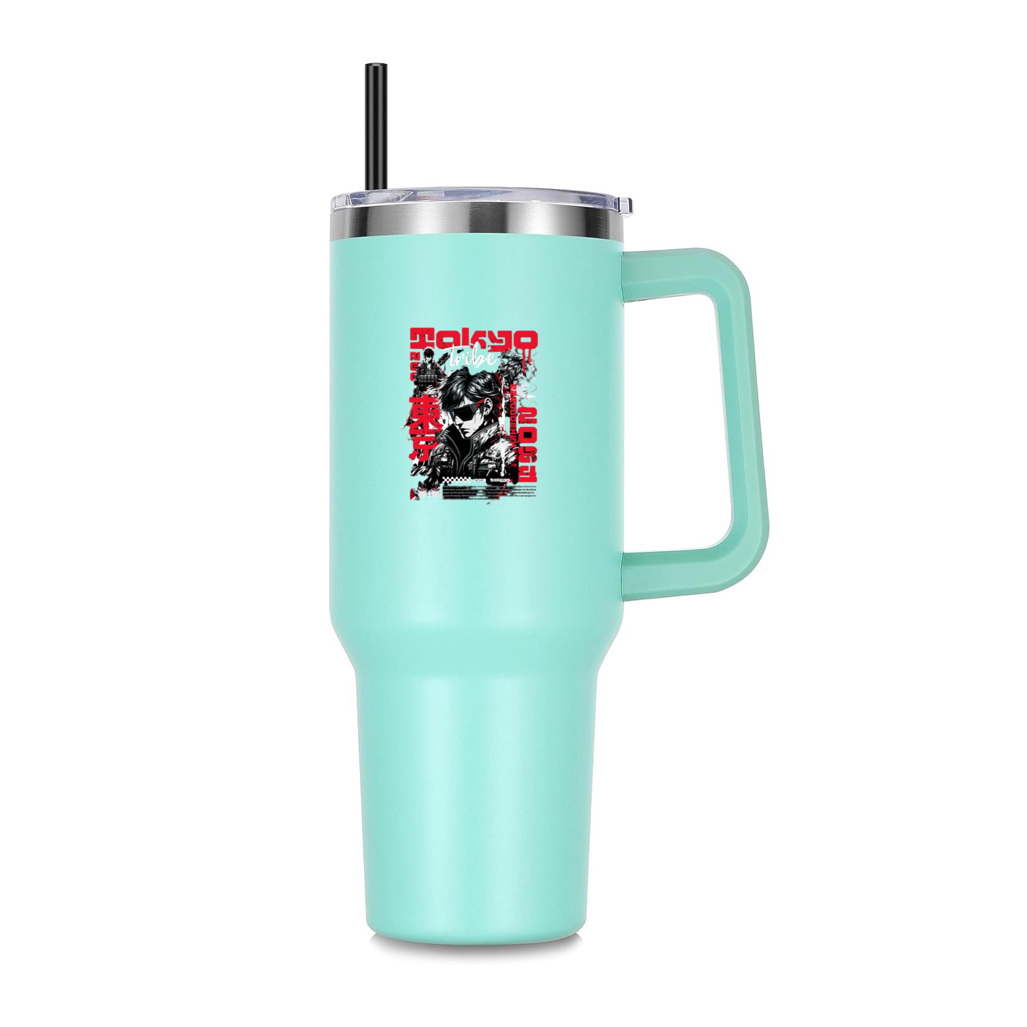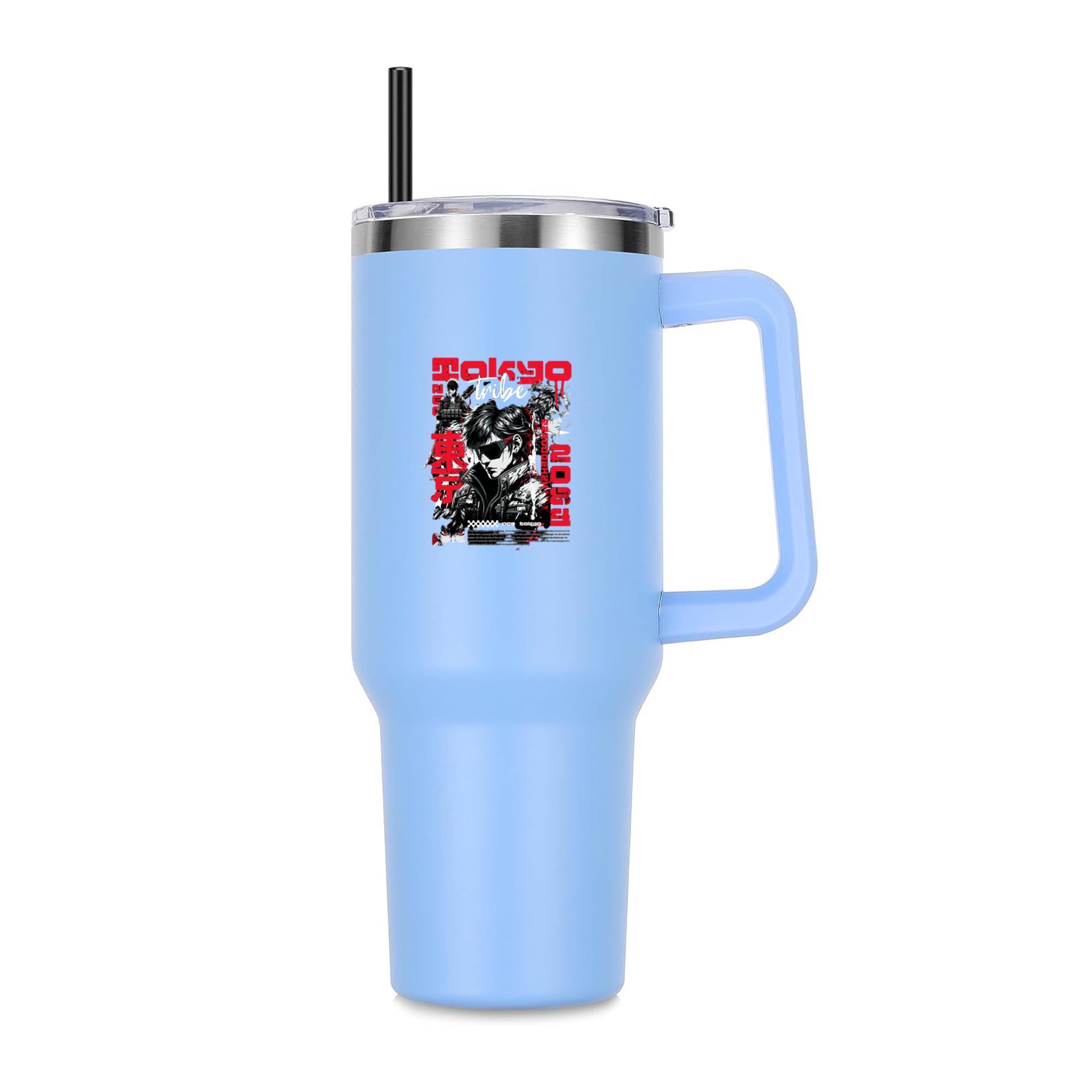 Designed with a sturdy ergonomic handle for easy carrying and a spill-resistant lid with reusable straw, this tumbler is ideal for water, coffee, smoothies, or any beverage on the go. The sleek, powder-coated finish resists scratches and condensation, while the tapered base fits most car cup holders — making it a perfect blend of function and design.