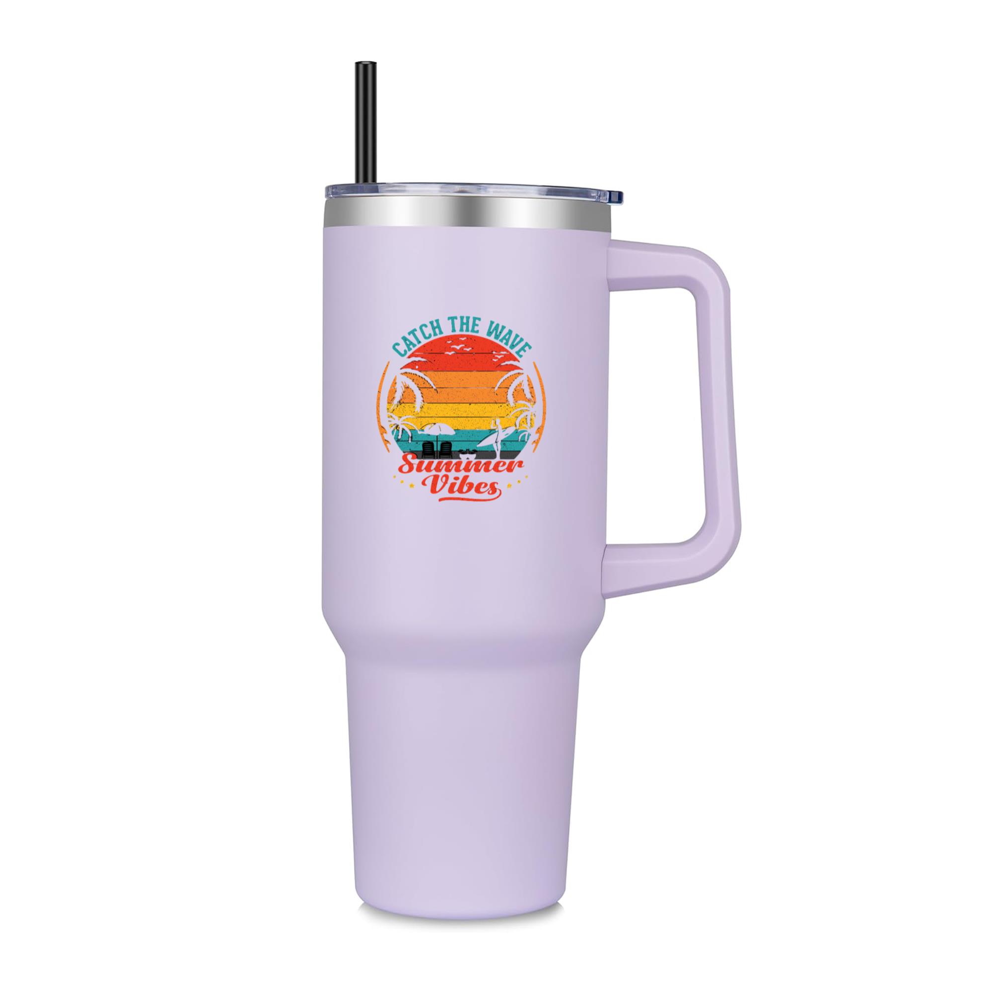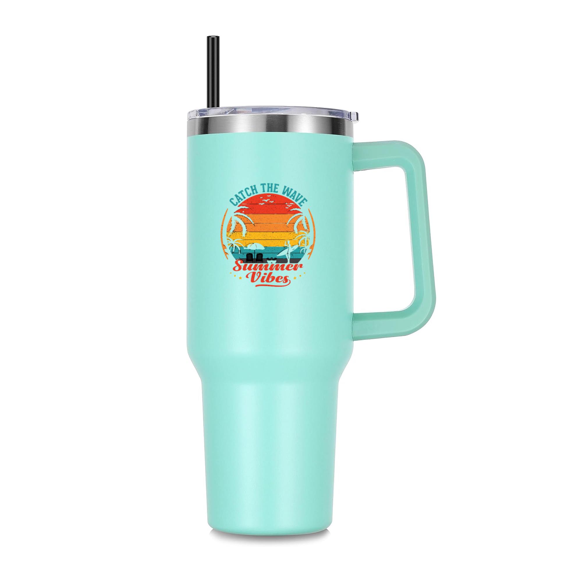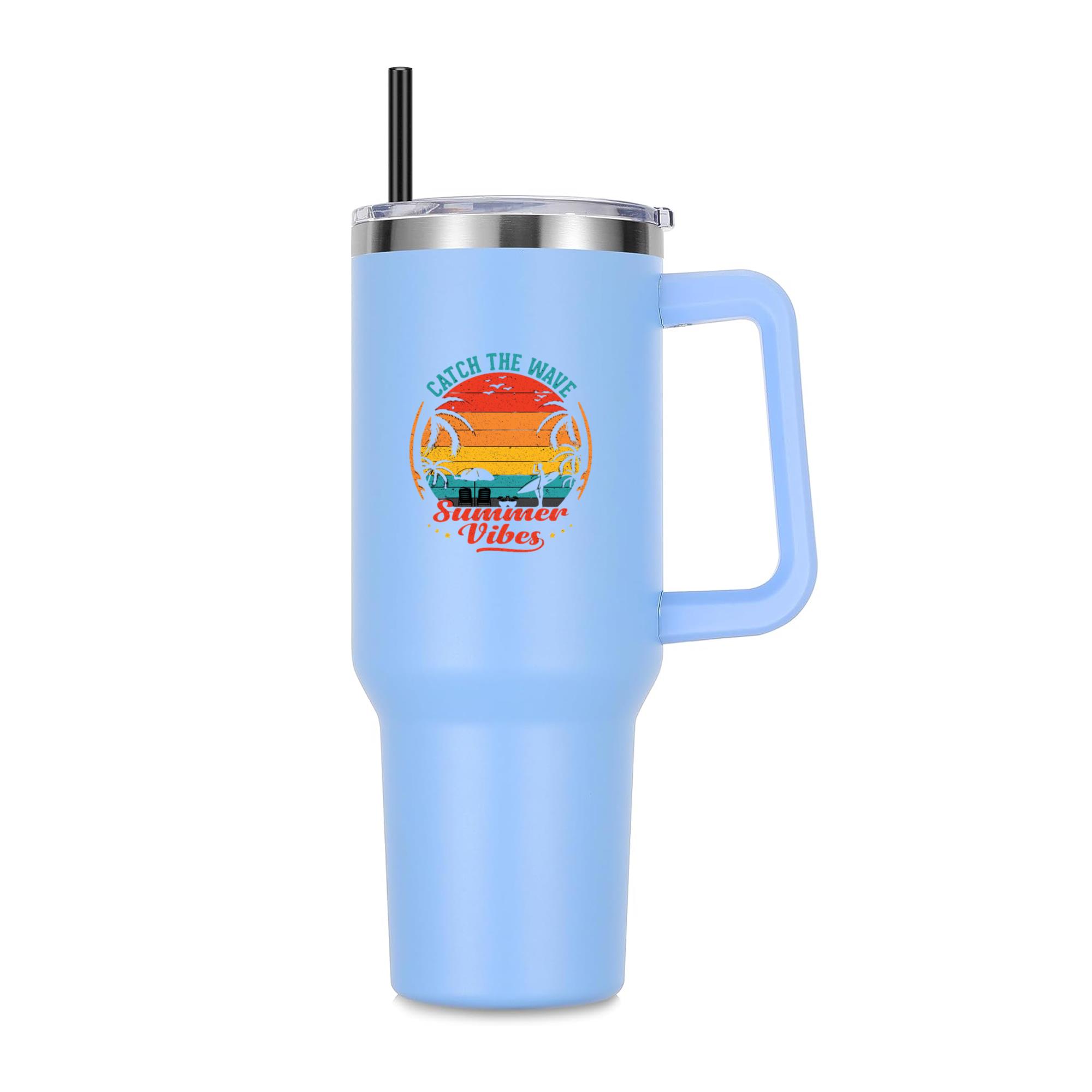 Designed with a sturdy ergonomic handle for easy carrying and a spill-resistant lid with reusable straw, this tumbler is ideal for water, coffee, smoothies, or any beverage on the go. The sleek, powder-coated finish resists scratches and condensation, while the tapered base fits most car cup holders — making it a perfect blend of function and design.