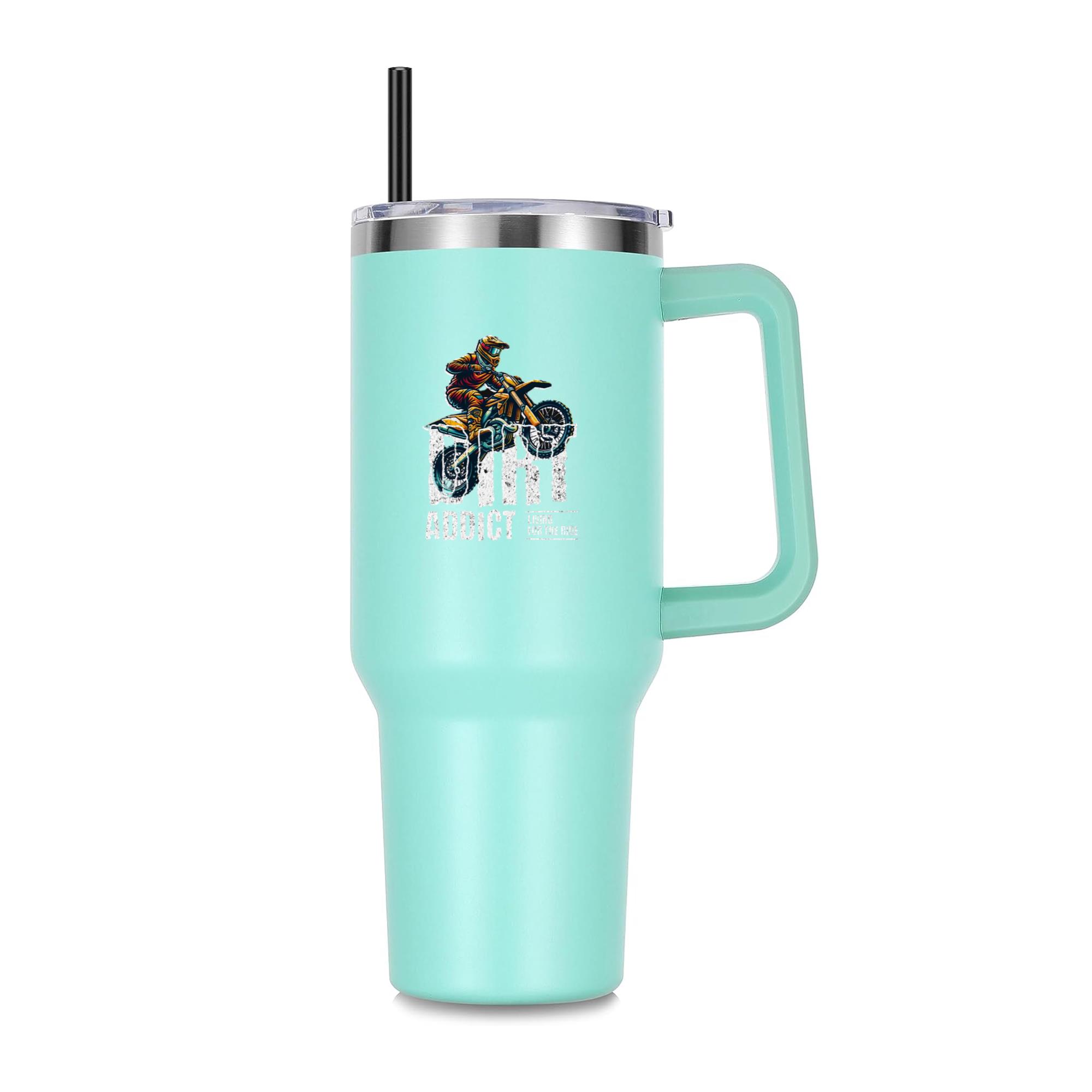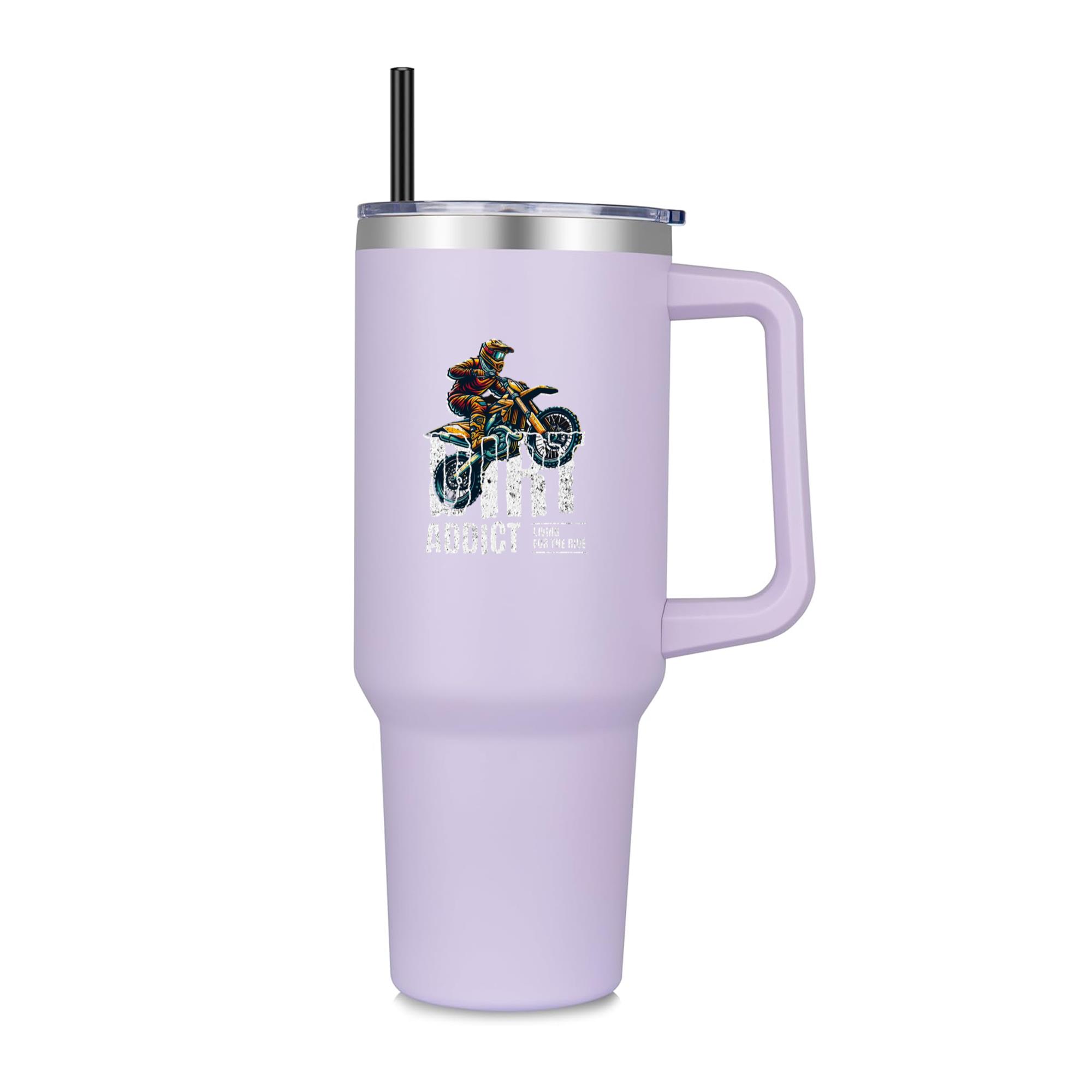 Designed with a sturdy ergonomic handle for easy carrying and a spill-resistant lid with reusable straw, this tumbler is ideal for water, coffee, smoothies, or any beverage on the go. The sleek, powder-coated finish resists scratches and condensation, while the tapered base fits most car cup holders — making it a perfect blend of function and design.