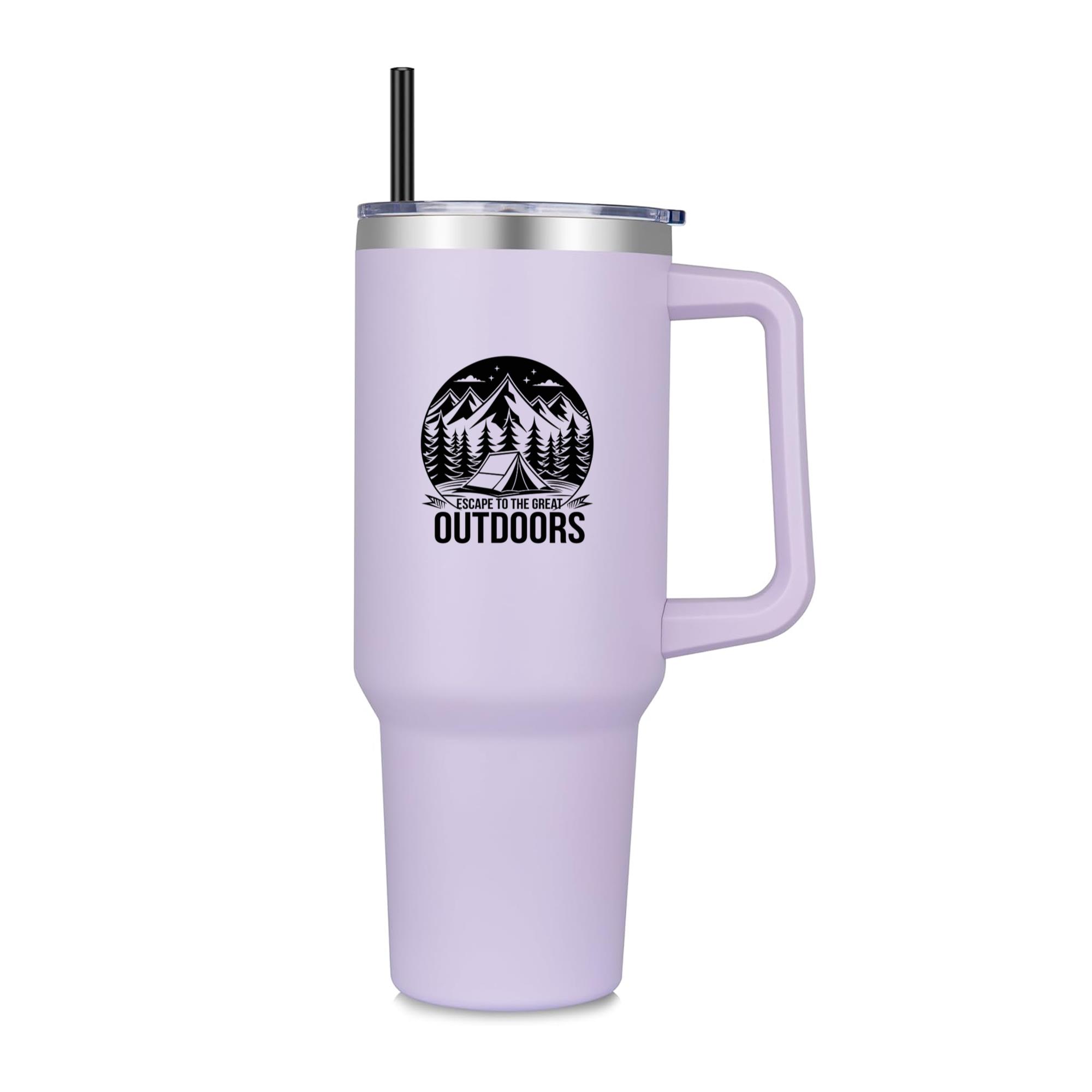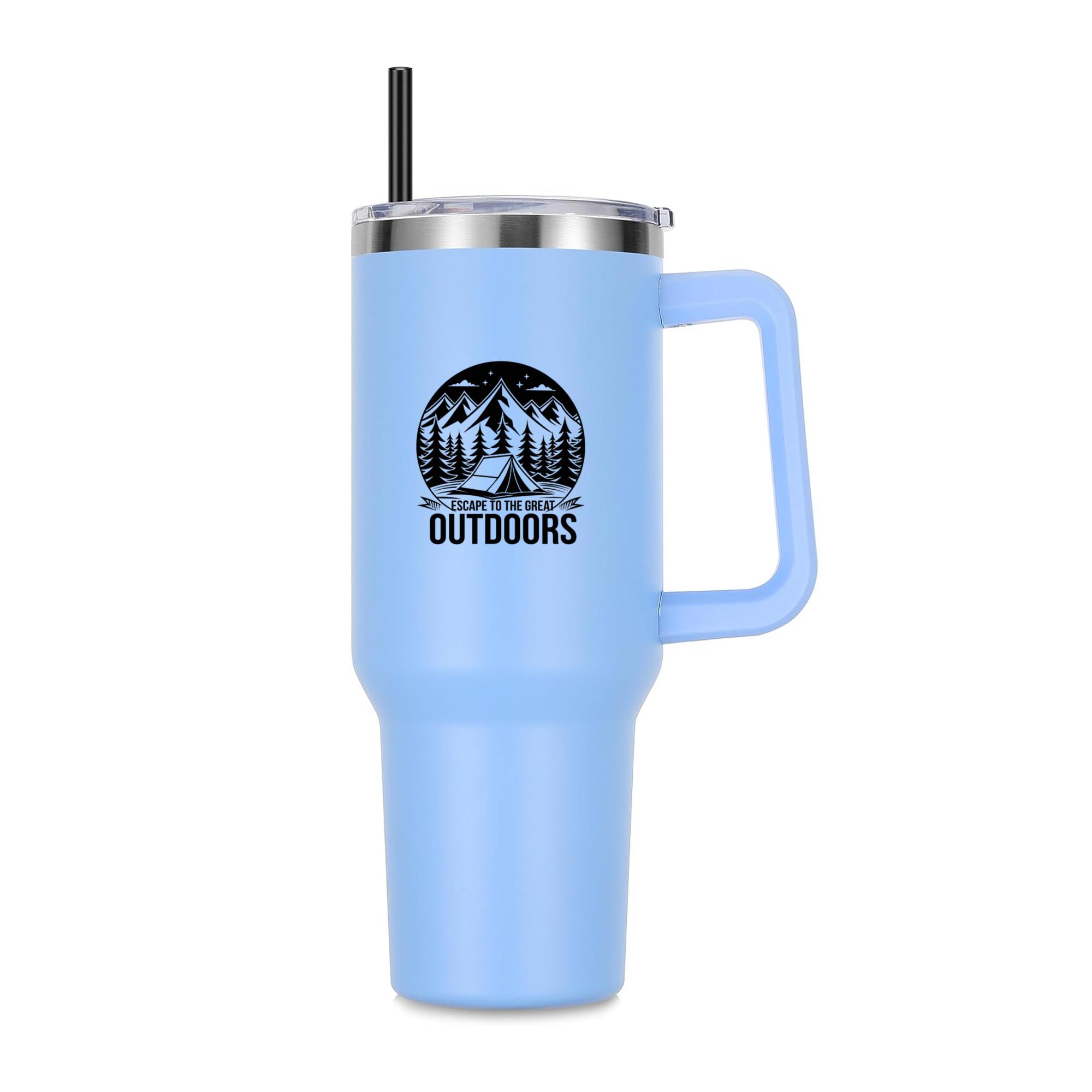 Designed with a sturdy ergonomic handle for easy carrying and a spill-resistant lid with reusable straw, this tumbler is ideal for water, coffee, smoothies, or any beverage on the go. The sleek, powder-coated finish resists scratches and condensation, while the tapered base fits most car cup holders — making it a perfect blend of function and design.